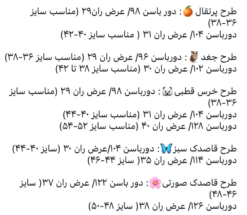 طرح پرتقال (40-42): دور باسن 104 cm - عرض ران 31 cm