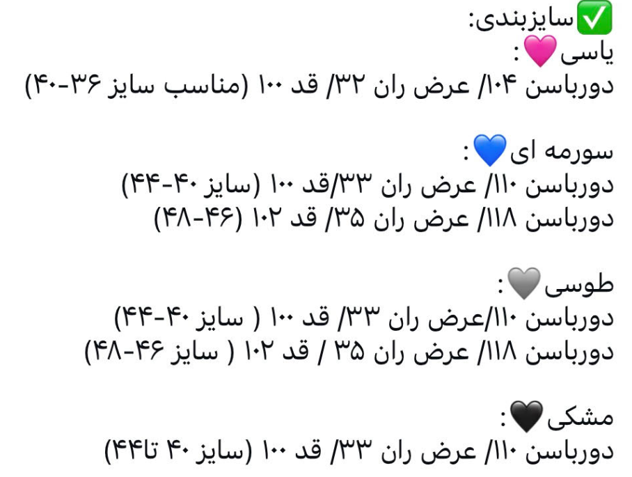 طوسی (40-44): دور باسن 110 cm / عرض ران 33 cm / قد 100 cm
