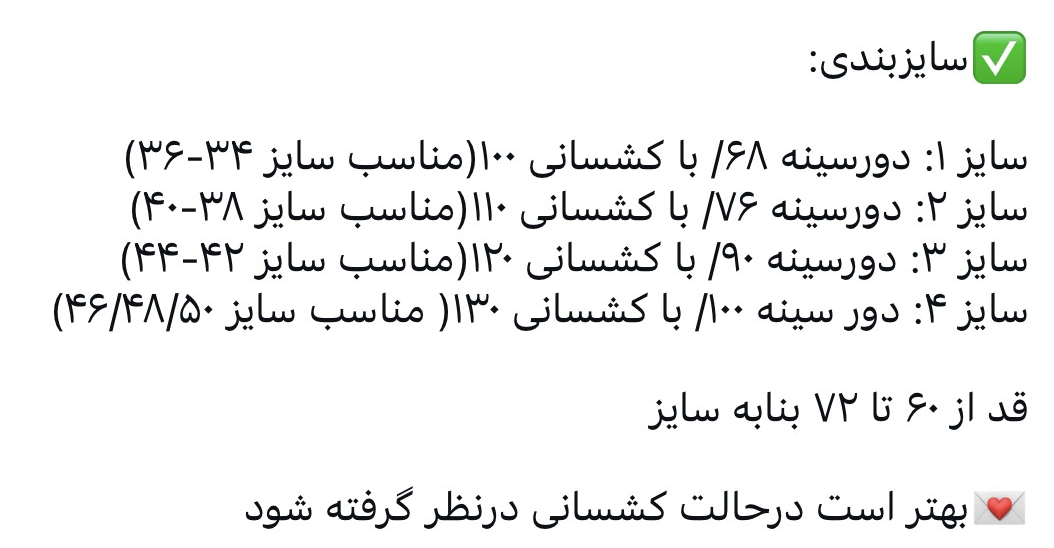 سایز 1 (34-36)دور سینه 68 cm / با کشسانی 100 cmسایز 2 (28-40)دور سینه 76 cm / با کشسانی 110 cmسایز 3 (42-44)دور سینه 90 cm / با کشسانی 120 cmسایز 4 (46-48-50)دور سینه 100 cm / با کشسانی 130 cm
